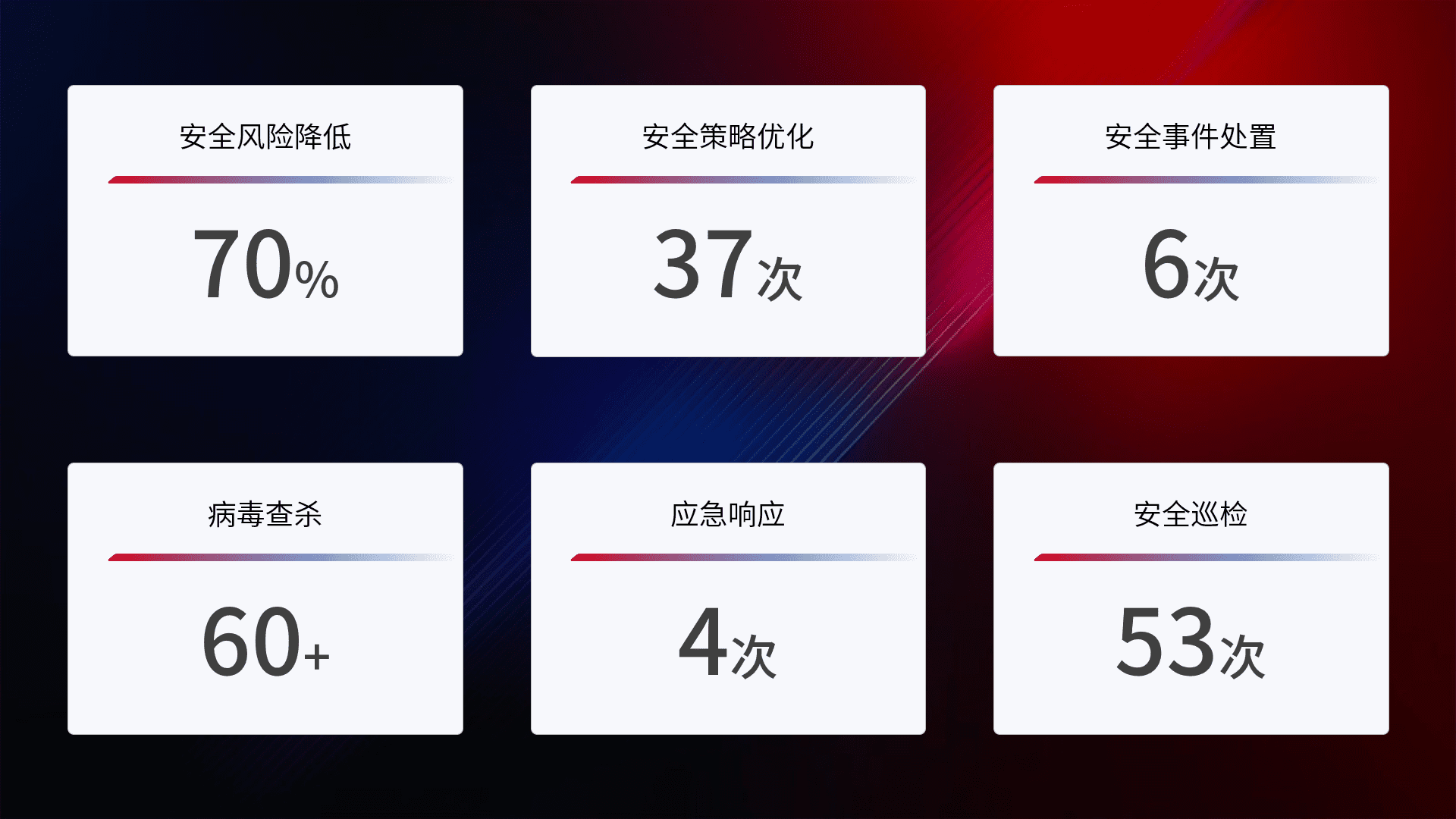 提供全面的安全事件报告体系,,包括处置报告、、、、周报、、、季度和年度总结,,,结合持续监控,,,,帮助客户深入了解网络安全状况。。
